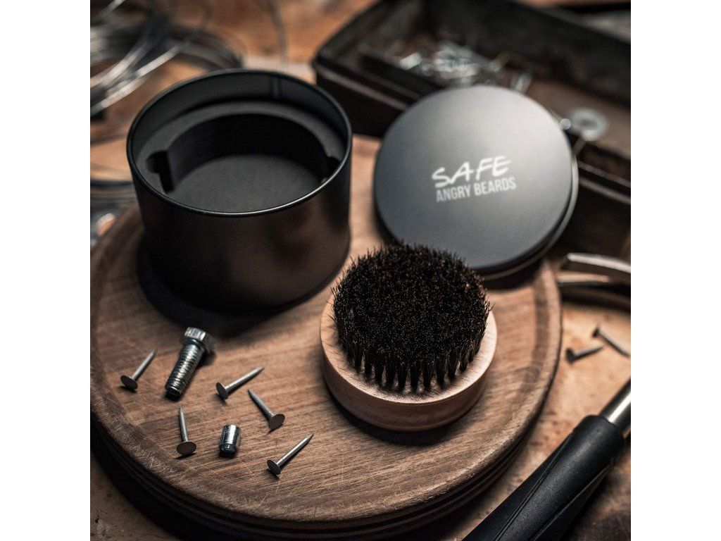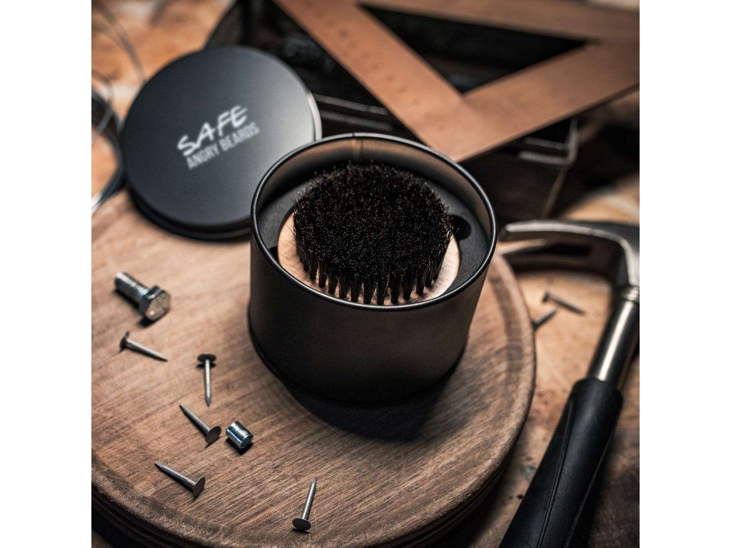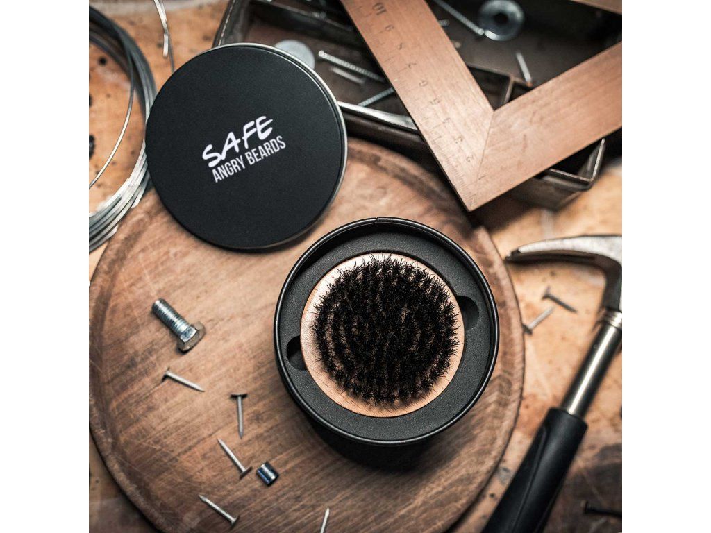 Safe kartáč má průměr 6,7 cm a oproti ostatním kartáčům není oválný, ale dokonale kulatý. Po celým obvodu má oblý výbrus, aby ti líp sedl do ruky. Vyrobenej je z bukovýho dřeva a osázen kančími štětinami, samozřejmě plně antistatickými. Vousy uhladí a pořádně pročešou. Borec na konec je pak plechovej sejf, kterej ke kartáči dostaneš a do kterýho můžeš tenhle poklad po použití zavírat.
